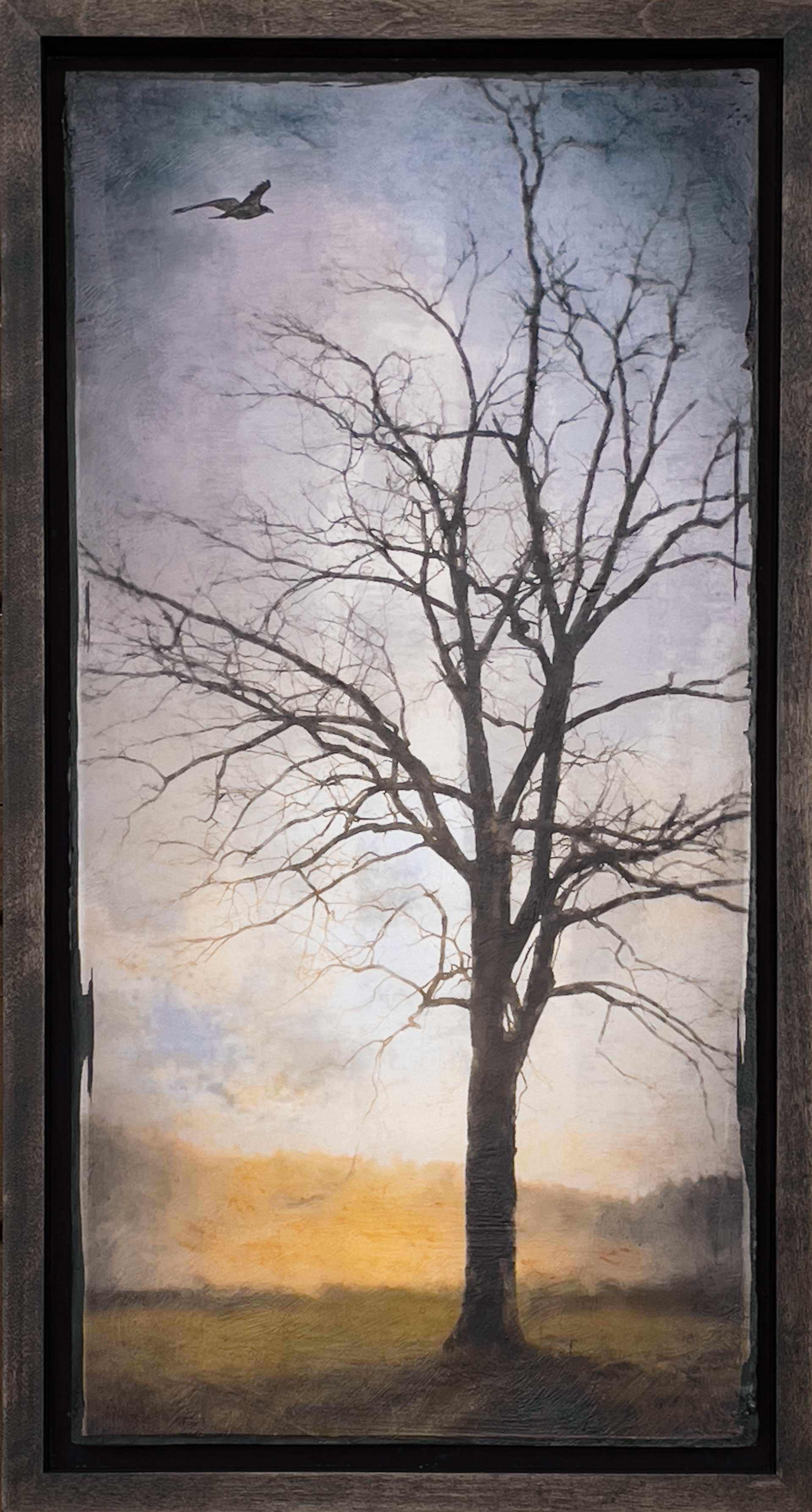 A photo encaustic and hand embellished image of a tree and a raven (a most intelligent bird!) This image measures 12X24 inches and is offered at $190.