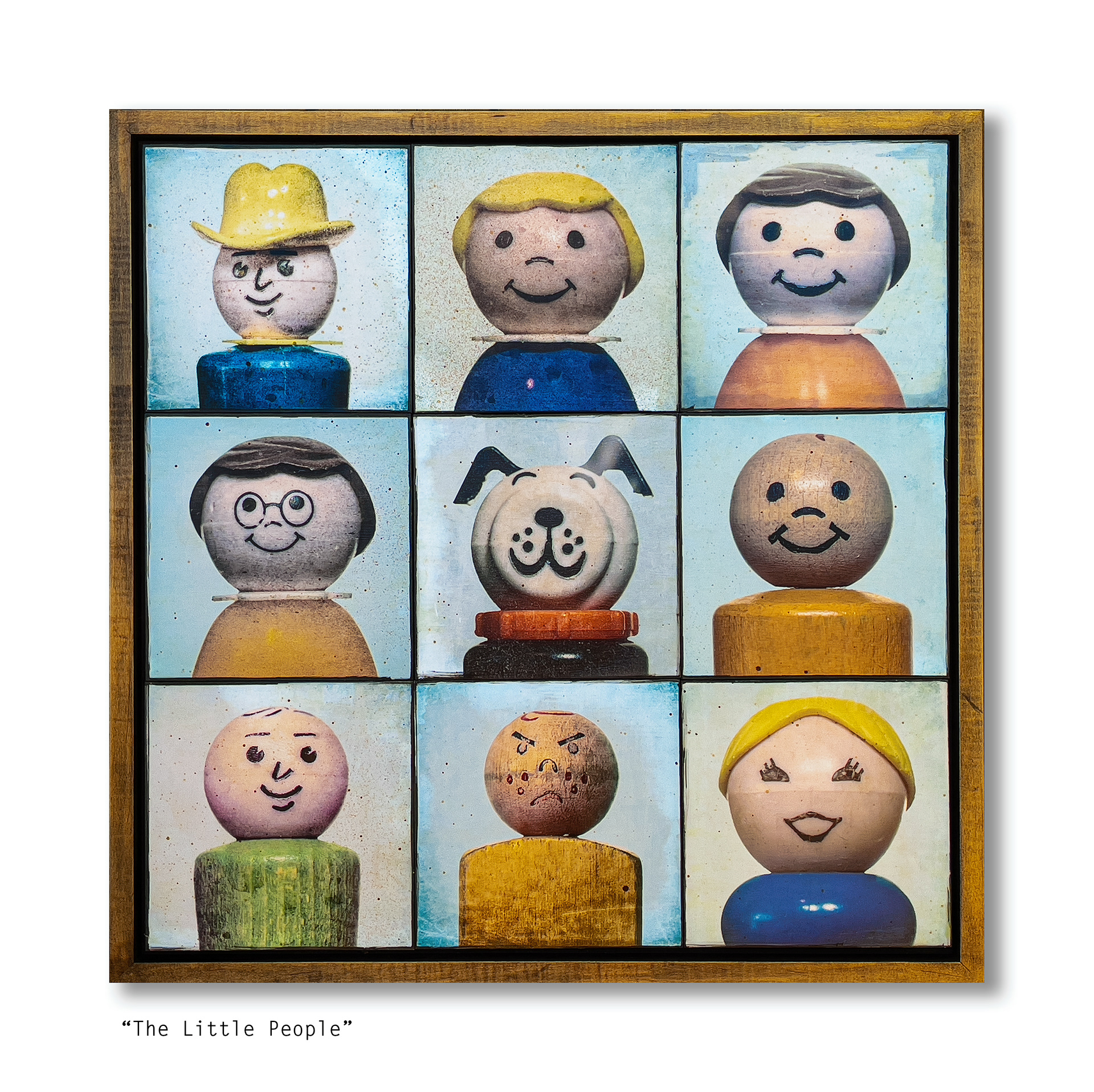 "The Little People" A photo encaustic of the classic Fisher Price "Little People" toys. Overall image is 26X26" and consists of nine 8X8" images. This piece is offered at $810.